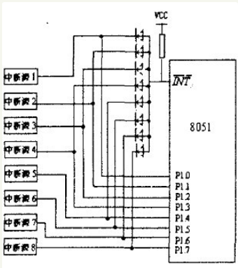 扩展的8个外部中断源均通过二极管向I N T(x=0或I)请求中断。当某个外部中断源请求中断服务时输出低电平,单片机的I NT 经二极管接地电平,单片机满足响应外部中断(I N T)请求条件,响应中断,程序立即转向I NT 对应的中断入口地址处开始执行中断服务程序,通过软件查询PI.0~P1.7口外中断源的状态,以识别提出请求的外扩中断源,并转向中断服务程序为其服务,其查询顺序即为外部扩展中断源的中断优先级顺序。在图中,是选用PI.0~PI.7作为外扩中断源请求的状态信息输入端口。有点类似第一种方法。
