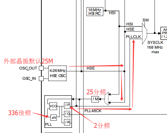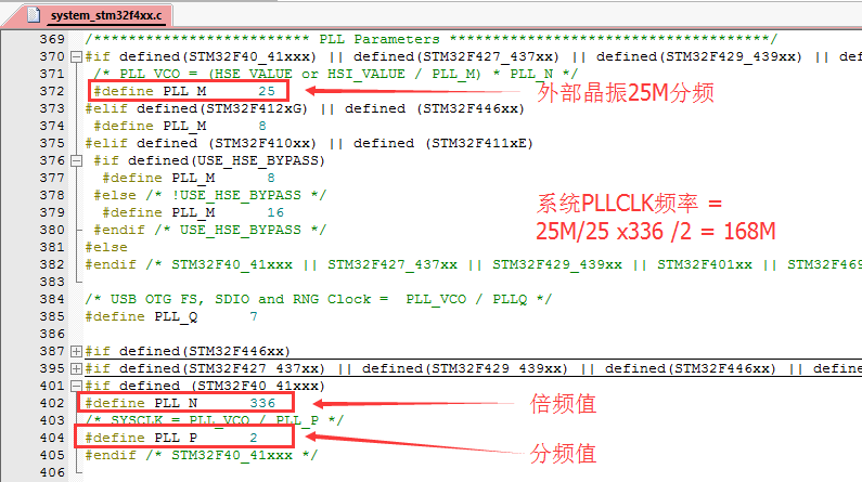 结合上面时钟树和源代码可以看得出来,系统时钟PLLCLK的计算主要是配置PLL_M、PLL_N、PLL_P这三个参数,最后168M是通过分频、倍频得出来的。