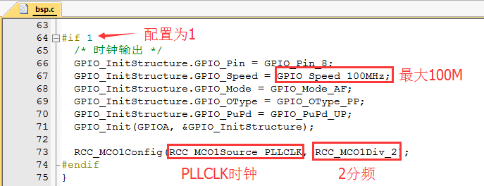 我提供的代码里面就有这一选项,将定义配置为1,就打开了这个功能。时钟输出的参数有两个,时钟源,分频值。注意:这里的最大输出时钟是100M,所以PLLCLK时钟分频之后才能输出,不然你用示波器检测不到波形(我测试过了)。