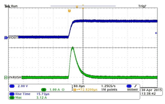 图 3:启动期间的浪涌电流曲线(具有较大的容性负载)