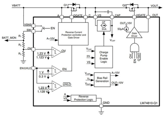 图 6:具有过压保护功能的 LM74800 典型方框图