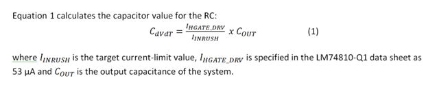如图 7 所示,向 LM74810-Q1 的 HGATE 引脚添加电阻电容(RC)可减慢启动期间的 HGATE 电压斜升,从而实现浪涌电流限制。