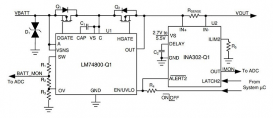 提供瞬态保护的一种方法是使用理想二极管控制器。如图 5 所示,使用电流感应放大器和理想二极管控制器可以实现额外的过流保护,从而提供优于滤波和电源调节的全面保护解决方案。