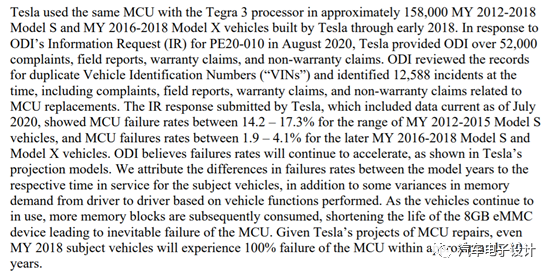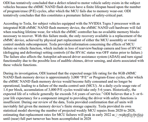 1)特斯拉自己都确认了,由于选择的 Flash 8GB 不够用,所有的 MCU 娱乐控制器最终将不可避免地发生故障。按照 3000 次计算,整个寿命为 5-6 年。