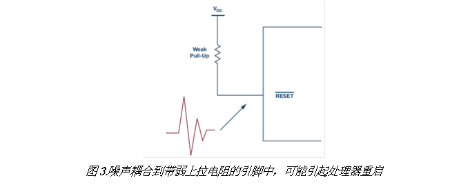 1. 在实验室正常工作的处理器,在现场可能莫名重启,因为噪声耦合到没有足够强上拉电阻的RESET(复位)线中。