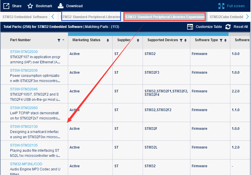 开发STM32相关资料下载”讲述了“标准外设库”的下载地址,其实同一个地址下“STM32 Standard Peripheral Libraries”旁边有一个“STM32 Standard Peripheral Libraries http://www.st.com/content/st_com/en/products/embedded-software/mcus-embedded-software/stm32-embedded-software.html?querycriteria=productId=SC961