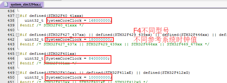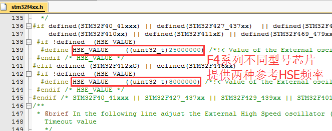 对于初学者,容易受到影响的就是两个参数:HSE_VALUE(外部晶振频率)、SystemCoreClock(系统时钟)。这个两个参数在ST提供的库中都有一个参考值,一般的开发板都是按照参考值设计的晶振,所以不用修改。但如果不同,那么就要修改。位置分别在“stm32fxxx.h”和“system_stm32fxxx.c”文件下面,如下图(F4系列为例):