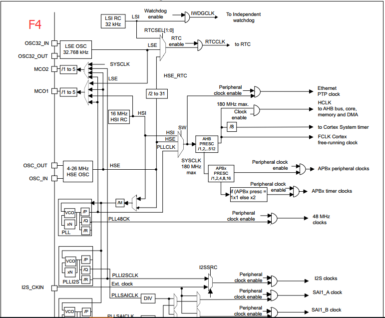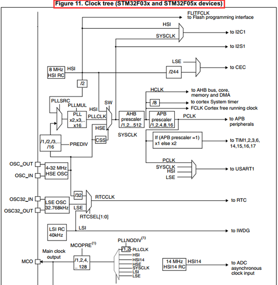 时钟树是很好反应时钟时钟源选择、分频、倍频的一个框图,要深入理解,请下载相关参考手册查看RCC章节的时钟树,下面截取部分系列芯片时钟树图:
