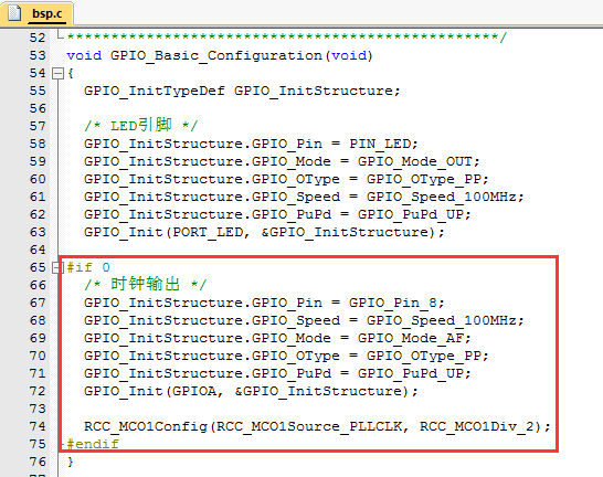验证时钟配置是否正确的方法可以通过MCO输出时钟,用示波器检测一下就知道了。我前面提供的软件工程中有一段代码(如下图),主要就是MCO时钟输出的代码。