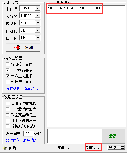 下面讲述在不同代码写法下,得到不同实验效果【调试助手接收数据】: