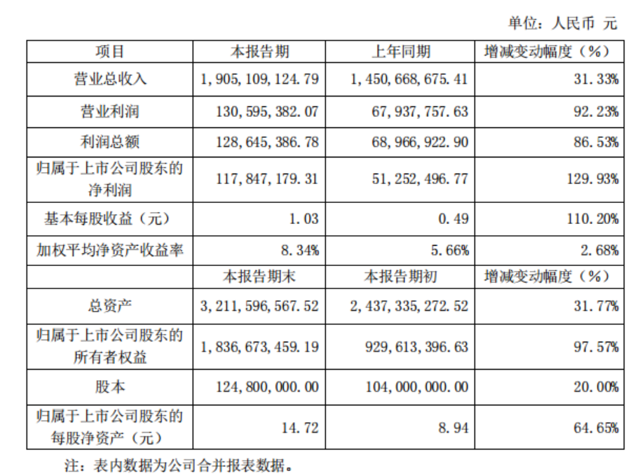 1月20日,三利谱披露2020年度业绩快报。三利谱2020年实现营业总收入1,905,109,124.79元,同比增长31.33%;实现归属于上市公司股东的净利润117,847,179.31元,同比增长129.93%;基本每股收益1.03元。