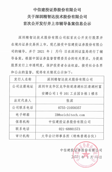 1月20日,深圳监管局披露了深圳精智达技术股份有限公司(以下简称“精智达”)拟首次公开发行股票并在境内证券交易所上市的辅导备案信息,其辅导机构为中信建投证券股份有限公司,备案日期为2021年1月14日。