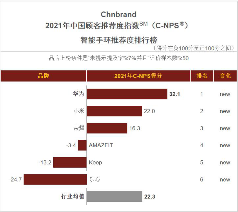 在智能手环推荐度排行榜中,华为依旧以32.1的C-NPS得分排在第一位,远远的甩开了排在第二位的小米。