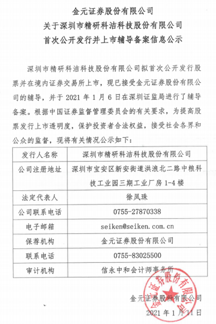 据披露,精研科洁拟首次公开发行股票并在境内证券交易所上市,现已接受金元证券股份有限公司的辅导,并于2021年1月6日在深圳证监局进行了辅导备案。