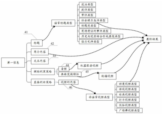 如上图,为该专利中方法所对应的技术体系架构示意图,这种谣言识别方法可以从六个维度对第一信息进行分析,从而对第一信息进行全方位的把控,以使得到的最终结果更加准确,这六个维度分别为:维度41(标题)、维度42(简介信息)、维度43(文本内容)、维度44(音频)、维度45(画面变换特征)以及维度46(视频中视频图像包含的内容)。