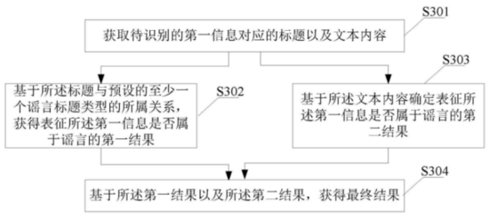 而当面对较为复杂的视频时,由于声音会存在例如背景音乐等干扰,因此该专利结合了音频和视频的方式,基于计算机视觉技术从视频包含的图像中获得文本,以弥补音频的缺陷。其次,系统会基于标题与预设的谣言标题类型的从属关系,来判断初始获得的信息(第一信息)是否为谣言,记录为第一结果。