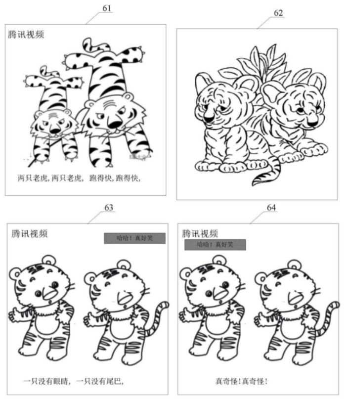 图像61中的文本信息包括: “腾讯视频”以及“两只老虎,两只老虎,跑得快,跑得快,”;图像63中的文本信息包括: “腾讯视频”、 “一只没有眼睛,一只没有尾巴,”以及“哈哈!真好笑”;图像64中的文本信息包括: “腾讯视频”、 “真奇怪!真奇怪!”以及“用户1:哈哈!真好笑”。