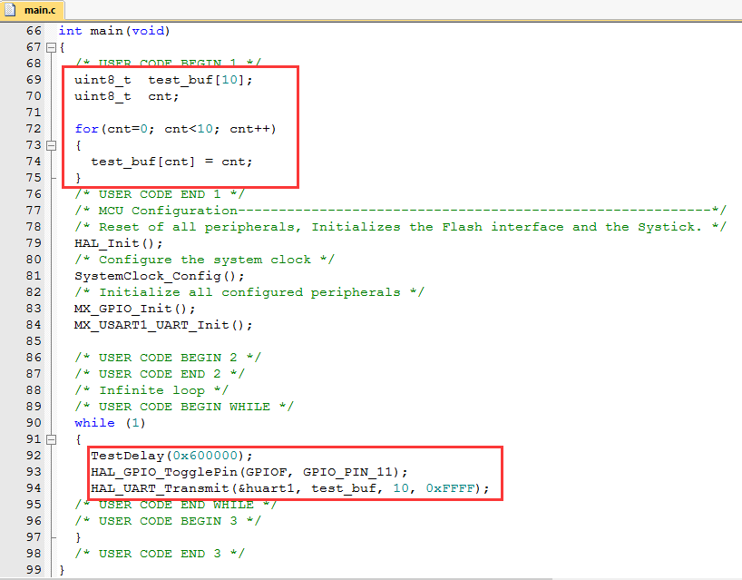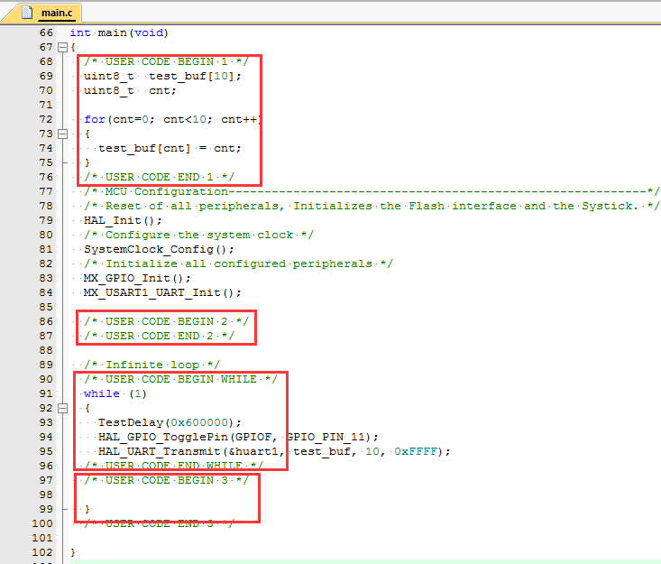 打开使用STM32CubeMX新建的软件工程可以看见很多地方有成对的注释代码“USER CODE BEGIN”和“USERCODE END”,这两个注释之间就是用户添加自己代码的区域。如main.c文件下就有多处用户编程区域: