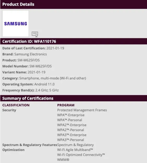 2021年01月21日 | 三星Galaxy Tab M62过WiFi联盟认证