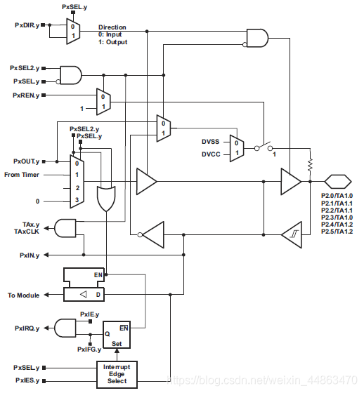 端口P1 和P2 中的每个引脚都有中断功能,此功能由PxIFG, PxIE,和PxIES 寄存器配置。所有P1 引脚提供一个单一中断矢量,而所有P2 引脚提供一个不同的单一中断矢量。在中断程序中,可测试PxIFG 寄存器来确定一个P1或P2 中断的源。
