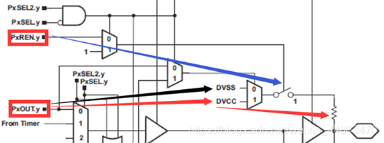 每个PxREN 寄存器中的每个位启用或者禁用相应I/O 引脚的上拉/下拉电阻器。 PxOUT寄存器中的相应位选择上拉或下拉引脚。