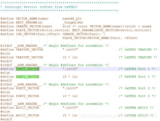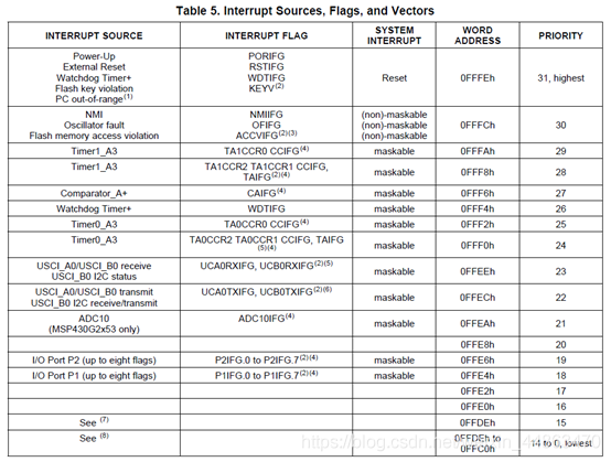 #include void main(void) { WDTCTL = WDTPW + WDTHOLD; P1DIR = BIT0; P1OUT = BIT3; P1REN |= BIT3; P1IE |= BIT3; //(1)中断使能 P1IES |= BIT3; //(2)下降沿触发 P1IFG &= ~BIT3; //(3)清零标志位 __enable_interrupt (); //(4)开总中断 while(1); } #pragma vector=PORT1_VECTOR //固定格式 __interrupt void Port_1(void) { P1OUT ^= 0x01; P1IFG &= ~0x08; //每次软件复位 } 中断向量表 表中第一列是中断事件来源的名称;第二列是对应的中断标志位;第三列表示中断的性质,其中 non-maskable 是无法关掉的中断,即不受 GIE 控制的中断, maskable 是可以被 GIE 关掉的中断;第四列是中断向量在存储器中的位置;最后一列就是***中断优先级***。 中断向量表中大多数中断属于“grouped interrupt”,即多个中断源共用一个中断向量入口。例如 P1.0-P1.7 中断都使用 P1 中断这一个入口。要识别中断具体来自哪一个 I/O 口,需要查看P1IFG 寄存器, P1IFG 共 8 位,分别对应 P1.0-P1.7,当某个引脚出现中断事件时对应的P1IFG.x 就会被置位,在退出中断之前一定不要忘记手动将 P1IFG.x 复位。另外 P1IE 是 P1 口的中断使能寄存器,也有 8 位,可以分别控制每个 I/O 口的中断使能 如何写一个中断函数总结 要写一个带有中断的程序,需要做下面几件事情: 配置外设中和中断有关的寄存器,例如 I/O 口中断是上升沿触发还是下降沿触发, 定时器中断的计数方式和定时值等等。 依照中断服务函数的模板写中断服务函数,添加中断后要干什么的代码。 使能外设的中断,使能全局中断(GIE) 一旦中断发生, CPU 停下主函数中的任务,并标记位置,进入中断服务函数,执行完中断服务函数之后回到主函数标记位置处继续运行。 中断服务函数 #pragma vector=PORT1_VECTOR __interrupt void Port_1(void) { P1OUT ^= 0x01; // P1.0 = toggle P1IFG &= ~0x08; // Clear P1.3 IFG } #pragma vector=PORT1_VECTOR #Pragma 是编译器指令,是告诉编译器将函数与中断向量连接起来。 “vector=”后面是中断向量地址的宏定义,例如 P1 口中断就是 PORT1_VECTOR,定时器中断就是TIMER0_A1_VECTOR。 不同外设的中断向量名在哪里找呢?打开 CCS 的安装文件夹,例如C:ticcsv7ccs_basemsp430include,在这个文件夹中搜索芯片的具体型号,如msp430g2553,可以找到一个名为 msp430g2553.h 的头文件。这个头文件中包含了所有寄存器位的宏定义,包括中断向量的宏定义。 在 msp430g2553.h 中找到“Interrupt Vectors”这个部分(如下图),其中包含了所有中断向量的名称。 例如 P1 端口的中断向量名就是PORT1_VECTOR。 __interrupt void Port_1(void) __interrupt 关键字表明这是一个中断服务函数,CPU 见到这个关键字以后就会去做中断之前的准备工作。 Port_1 是用户自己取的函数名称,这个名称可以任意命名。 中断服务函数的具体内容 中断服务函数的内容依据中断的不同种类有所差别。退出中断前一定不要忘记将中断标志位复位。