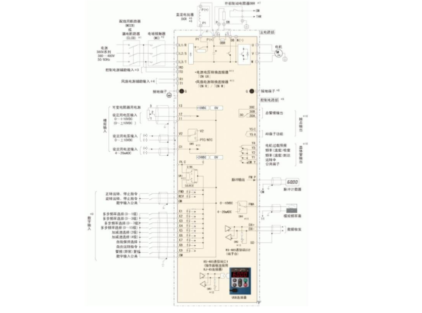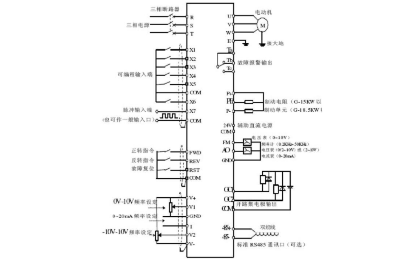 电机变频器的回接线路主要如下,R、S、T三个端口分别为电源进电的输入口,变频器输出端口为U、V、W这三种,它们被分别接到电动机上。当我们对电机的变频器金习惯正转的话,我们先将中间继电器和电机这两者一起接入控制输入公共端,此时正转启动,中间继电器的常开触点因为闭合而得电,此时电机正转,如果电流流失,那么电机就会停止。