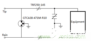 在POS机、ATM系统、安防系统中经常采用RJ11接口用于拨号上网、设备间或者与上位机之间的数据通信。RJ11接口的浪涌防护与RS-485等接口不同,由于RJ11的TIp和Ring信号线上振铃电压的存在,而该振铃信号的最大电压值可能超过100V,要求过圧保护元件的最小关断电压要高于振铃信号的最大值,以保证设备的正常工作。图3所示方案实现了电话线的浪涌防护和电力线搭碰测试需求。