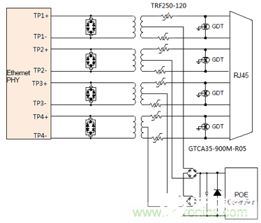 图2:TE典型POE1000M以太网浪涌防护方案