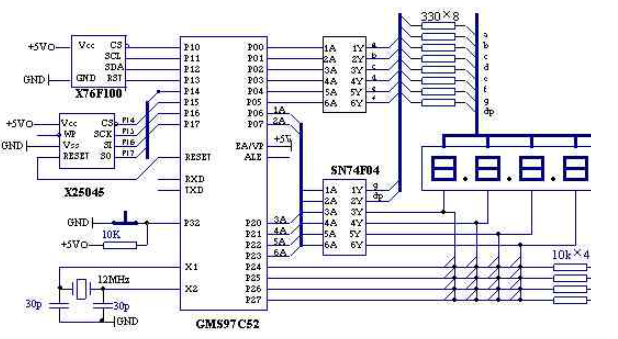 由于GMS97C52的驱动电流有限,在P0、P2口加反向器SN74F04,增加驱动能力。它的吸入电流为64mA,输出电流为15mA,可以保证位选所需的吸入电流。