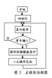 循环扫描键盘显示程序如图4所示,它采用程控扫描方式。键盘实际操作的顺序是:先按功能键,然后依次输入8位(十进制)密码,按回车键确认。当存取款时,随后输入所存取的款额;当修改密码时,随后输入8位新密码,输完后按回车键确认。若输入密码正确,显示IC卡内存款的余额或改密码成功信息(SUCCESS)。若密码不正确,提示重新输入,允许输入密码4次。