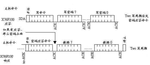 X76F100为I2C总线E2PROM。SCL为时钟输入,SDA为双向数据输入输出线。通过片输入来控制对器件的访问。下面以页写为例,先结合时序说明X76F100的工作过程,然后给出程序。