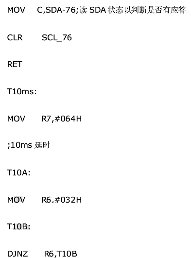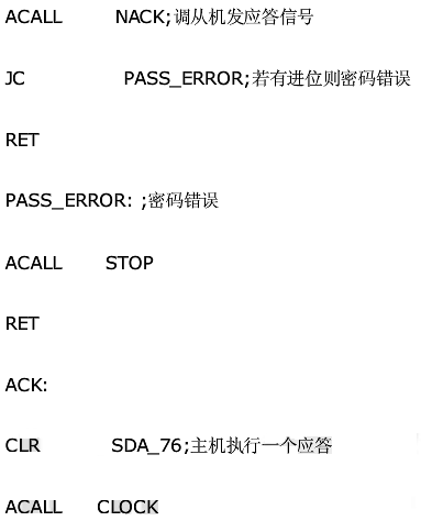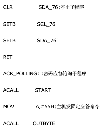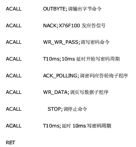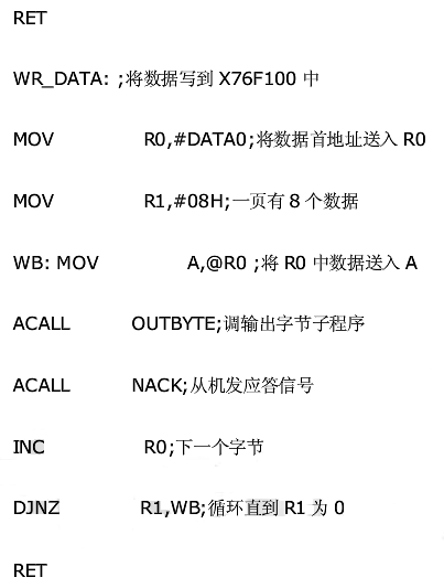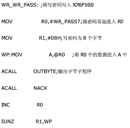 页写时序如图5所示。在该系统中,GMS97C52为主机,X76F100为从机。首先主机向从机发一个START命令,产生开始条件,然后发写命令字。当从机接到命令后,向主机发一个应答信号NACK。然后跟随8字节密码,随后进入一个写周期,写周期结束后进行密码应答轮询ACK Polling。X76F100要求主机用专用的应答命令55H进行应答轮询。如果输入的密码正确,将返回一个“ACK”。如果密码不正确,将返回“no-ACK”,重试计数器加1,返回到启始位置,提示重新送入写命令字和8字节密码。若密码正确,主机接着送入8个字节的数据,ACK响应成功后,主机发出STOP命令完成写操作。下面是用写密码进行页写的程序。
