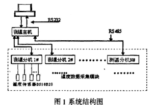 整个系统从结构上可分为三层:由微型计算机构成上位机——用户监控层,51 单片机系统分别构成测温主机——控制层和分机——温度数据采集层。上位机通过串行口与测温主机交换数据。测温主机与多台分机采用主从分布式结构。系统组成结构如图1 所示,测温主机与上位机通过RS-232 总线连接,测温分机与主机通过RS-485 总线连接。一台主机最多可管理64 台分机,一台分机可以测试大约1000 个温度点。本设计适用于中小型粮库。
