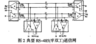 在系统中用51单片机构成主从分布式测控系统, 具有价格低、控制功能强等许多特点。然而在应用中,测温主机与各粮仓相距较远,距离从几十米到几千米不等。对此远程粮仓,系统采用RS-485总线实现数据的远程传输。进行串行通信的主机与分机的RS-485接口电路如图2.3所示。该电路以MAX485芯片为核心器件进行半双工通信,具有通信功能强、可靠性高、程序设计简单等特点。