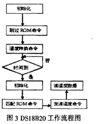 DS18B20 以单总线协议工作,测温分机首先发送复位脉冲命令,使信号线上所有的DS18B20 芯片都被复位,接着发送ROM 操作命令,使序列号编码匹配的DS18B20 被激活进入接收内存访问命令状态;内存访问命令完成温度转换、温度读取等工作(单总线在ROM 命令发送之前存储命令和控制命令不起作用)。DS18B20 工作流程见图3 所示。