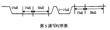 当总线于该时刻从高电平拉至低电平时,就产生“写”的时间间隙。从该时刻开始15us之内,应将所需写的位送到总线上,DS18B20在该时刻后的15—45us期间内对总线采样,低电平写入0,高电平写入1。连续写两位之间的间隙应大于1us。写时序如图5所示。