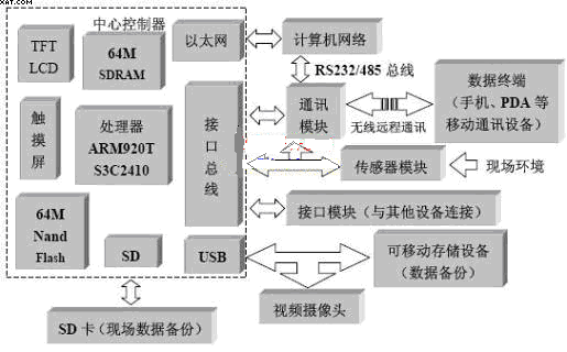 系统核心负责数据采集判断处理。为了提高系统工作效率,这里使用的是三星公司的 S3C2410芯片作为处理器。S3C2410 芯片是一款高性价比的 ARM 芯片,非常适合作手机、PDA 等手持设备。主要特性包括: ARM920T 内核,最高工作频率 203MHz,LCD 控制器:可直接驱动真彩液晶屏,最高支持 2048×1024 真彩液晶屏,2 个 USB Host端口,1 个USB Device端口,支持 Nand flash 启动模式,SD 卡接口,UART、IIC、SPI、IIS 等多种类 型串行接口, 4 通道DMA。