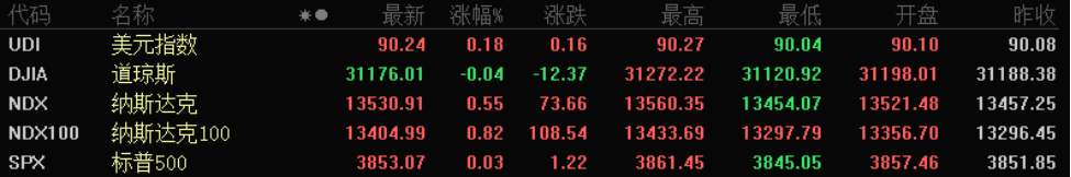 美股方面,道琼斯工业平均指数小幅下跌12.37点,跌幅为0.04%,报31176.01点。纳斯达克综合指数小幅上涨73.66点,涨幅为0.55%,报13530.91点。None小幅上涨1.22点,涨幅为0.03%,报3853.07点。