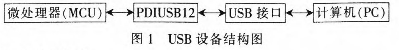 USB接口芯片采用的PDIUSB12是一种高性能USB接口器件,集成了SIE、FIFO存储器、收发器以及电压调整器。它支持本地的DMA传输,能够与外部的微处理器实现2 Mb/s的高速并行接口,集成了320 B的多配置FIFO存储器,在块传输模式下有1 Mb/s的数据传输率,可通过软件实现与USB相连,多中断模式实现批量和同步传输[1]。可以把PDIUSB12、MCU与计算机连接,本设计中与计算机相连的结构图如图1所示。