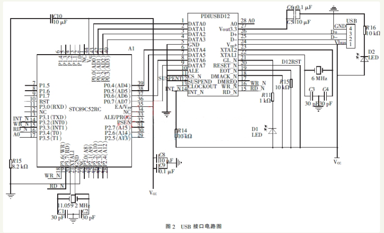 由STC89C52和PDIUSB12构成的USB接口电路图如图2所示,PDIUSB12的8位并行数据分别与STC89C52的P0口连接;ALE表示地址锁存功能,与GND相连,关闭地址信息锁存;CS_N表示片选功能,与GND相连,芯片一直处于工作状态;SUSPEND与GND相连,挂起功能失效;中断请求引脚INT_N与MCU的外部中断INT0相连,低电平时有效;RD_N和WR_N为控制信号,分别与单片机P3.3口和P3.4口相连;地址位A0与单片机P3.5口相连,当A0为高电平时表示单片机发出命令指令,当A0为低电平时表示单片机发出数据指令;DMA请求引脚DMREQ悬空;DMA应答引脚DMACK_N低电平时有效,它与VCC相连无DMA应答;可编程时钟输出DMACK_N悬空[2]。