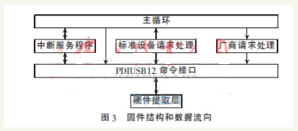固件结构和数据流向如图3所示。在硬件提取层中首先要对系统进行底层设置和识别,主要是对PDIUSB12和MCU的I/O口进行识别和加载的过程;PDIUSB12命令接口包含若干子程序命令,需要时可对子命令进行直接调用;中断服务程序(ISR)的主要功能是当PDIUSB12发送中断请求时,接收传来的数据并设定标志传给主循环程序;标准设备处理表示对USB的标准设备请求进行处理;厂商请求处理表示对用户添加的厂商请求进行处理[5];主循环主要是处理用户按键、I/O口等用户自定义功能和接收各模块的数据处理的功能。