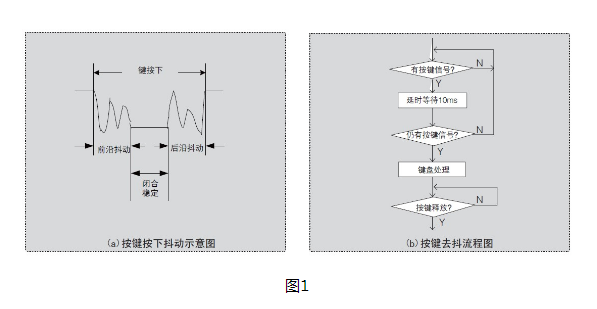 机械式按键再按下或释放时,由于机械弹性作用的影响,通常伴随有一定时间的触点机械抖动,然后其触点才稳定下来。其抖动过程如图1(a) 所示,抖动时间的长短与开关的机械特性有关,一般为5 ~ 10 ms。从图中可以看出,在触点抖动期间检测按键的通与断状态,可能导致判断出错。即按键一次按下或释放被错误地认为是多次操作,这种情况是不允许出现的。为了克服按键触点机械抖动所致的检测误判,必须采取去抖动措施,可从硬件、软件两方面予以考虑。一般来说,在键数较少时,可采用硬件去抖,而当键数较多时,采用软件去抖。( 本学习板采用软件去抖方式)。软件去抖的流程图如图1(b) 所示。