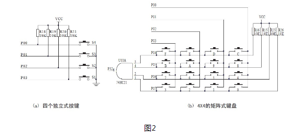 虽然独立式按键电路配置灵活,软件结构简单,但每个按键必须占用一根I/O 口线,因此,在按键较多时,I/O 口线浪费较大。对于比较复杂的系统或按键比较多的场合,可以用到矩阵键盘,图2(b) 中所示的为4×4的矩阵式键盘,其他矩阵式键盘的设计方法类似。