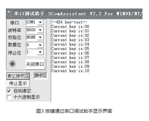接好硬件,通过冷启动方式将程序所生成的。hex文件下载到单片机运行后,打开串口调试助手软件,设置好波特率9600,复位单片机,然后按下板上的4×4按键中的任意一个,并注意观串口调试助手上的显示。(见图3),可以观察到在接收窗口有按键的数据显示。