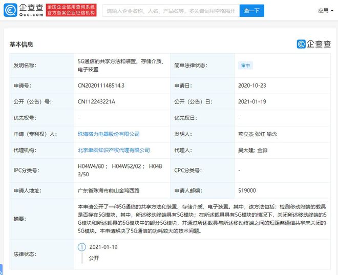 格力电器(000651)公开 “5G通信的共享方法和装置、存储介质、电子装置”专利信息,公开号为CN112243221A,申请日为2020年10月。