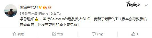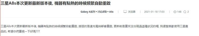 2021年01月24日 | 国行三星A8s更新现bug:新版本可导致手机的自动重启