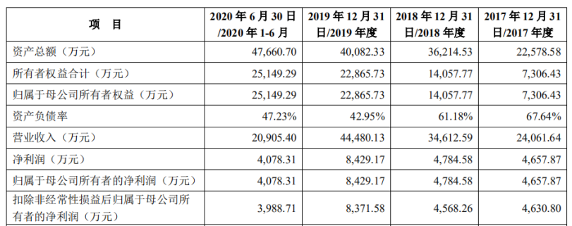 在营收不断增长的同时,其应收账款也在逐年上涨。2017年至2020年上半年,其应收账款账面余额分别为 1.55亿元、1.82亿元、1.63亿元和1.62亿元,占各期营业收入的比例分别为64.34%、52.54%、36.59%和77.69%。