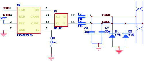 CAN收发器与CAN总线的接口如图2所示,其中SJA1000的TX0,RX0分别与CAN收发器的TXD,RXD相连,为提高CAN收发器82C250与CAN总线的接口部分的抗干扰能力,特在82C250 的CANH 和CANL 引脚串接一个共模扼流圈,以消除一定的共模干扰,而使得总线差分信号能够顺利通过。