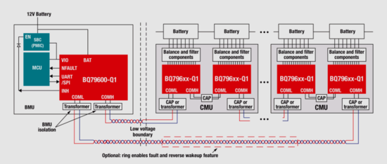 回到电池监测系统,电池单元电压和温度传感器连接到电池监测 ASIC;控制处理器通过读取测量信息来计算电池的当前状态,确保操作在安全范围内进行。对于高压电池组,监控 ASIC 以堆叠配置排列,每个 ASIC 并行测量多个单元。命令和数据通过一个隔离通信接口从 ASIC 传输到 ASIC。